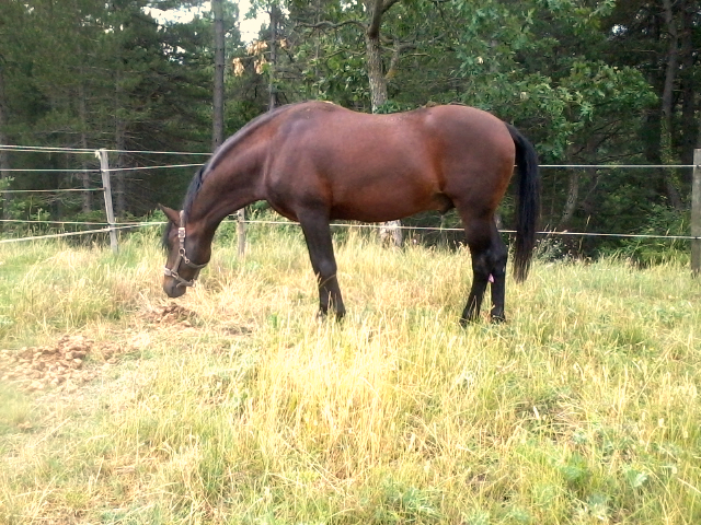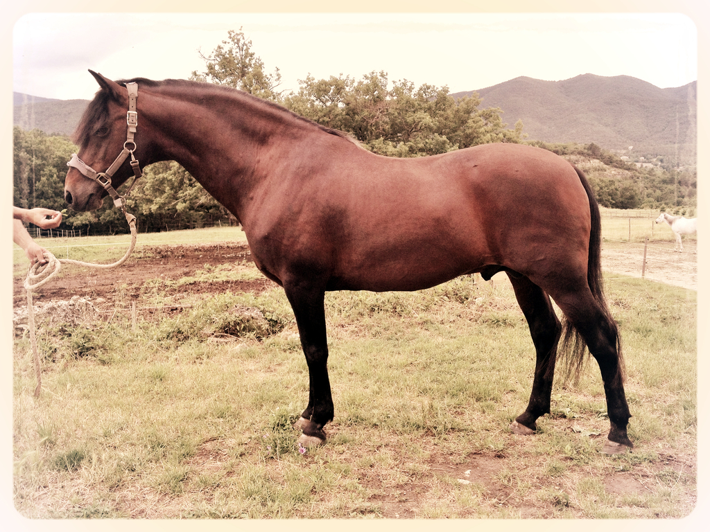 Espoir est un poney à la jolie tête expressive. Il est épais avec une encolure massive. De bon aplombs, bien armé dans ses dessous et une ligne du dessus solide et musculeuse.